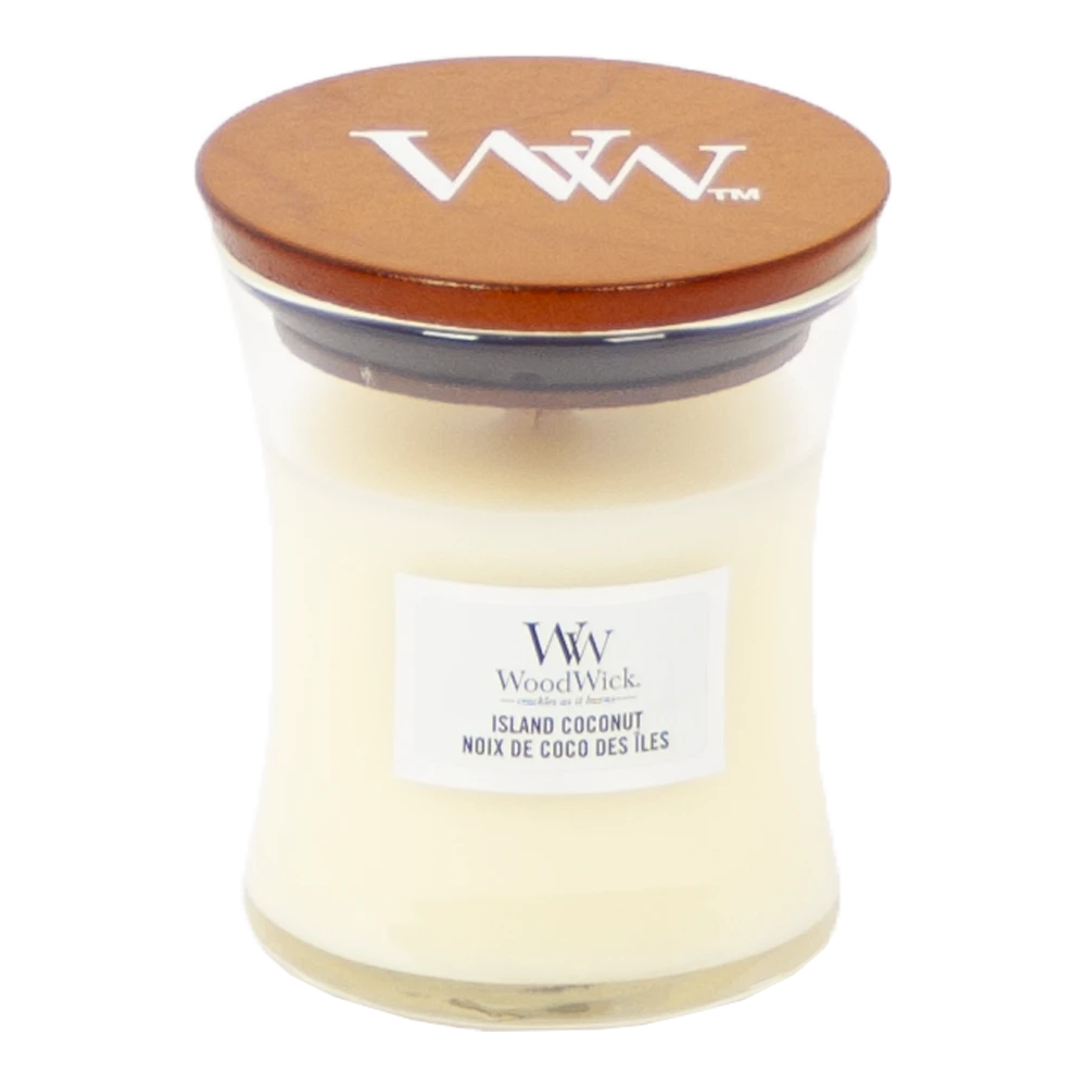 Details van de Woodwick Island Coconut geurkaars:
